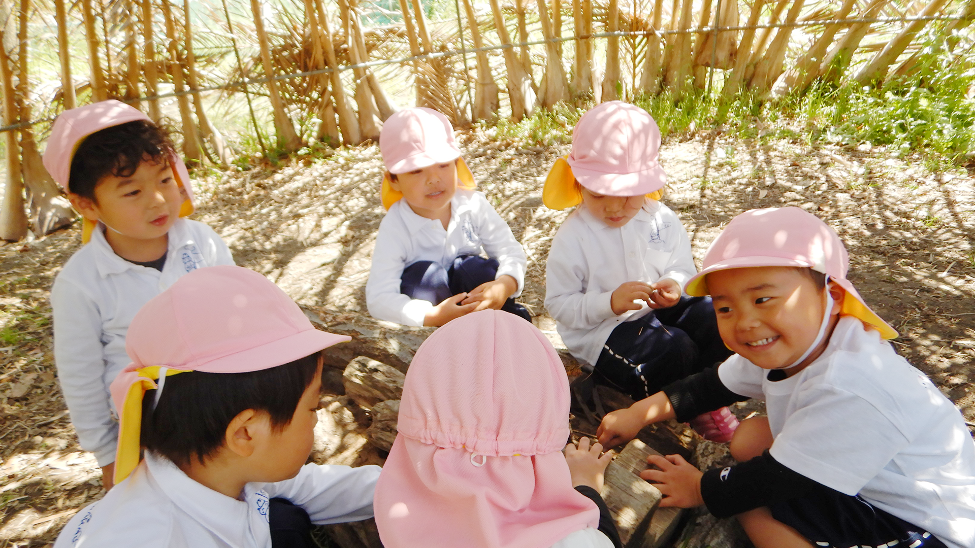 近くに休耕田を利用した『ハッピー広場』があり、木登り、竹藪の迷路、どんぐり拾いなど自然物での遊びを楽しんでいます。